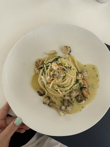 Ottima location, bellissimo ristorante. Camerieri svolgono un lavoro eccellente, servizio impeccabile. Molto apprezzato anche il pianista, alternando sia pianoforte che chitarra, passando dal repertorio clásico Nápoles o fino a quello moderno e anche inglese, un sottofondo che rilassa che sembra quasi ascoltare musica in radio in lontananza. Il 95% dei cibi serviti è a base di pesce, siamo andati in 4 persone e tutto era squisito. Antipasti di mare buonissimi, un "sushi" italiano accompagnato da salse e frutta a pezzi (mango e kiwi) che si accompagnavano bene con tutto il resto. Io ho preso una frittura di pesce, pezzi buoni, teneri e abbondanti, porzione ben proporzionata, e sua questo che altri piatti accompagnati da una base moderna gourmet di insalatine e varie. Come vino abbiamo preso un bianco coda di volpe. Per variare abbiamo preso un'ottima prussiana cotta al punto giusto. Dolce al pistacchio, acqua e amaro ci sono stati gentilmente offerti. Approfittando dello sconto con "the fork" abbiamo pagato 50 a testa per un totale di 200 tondi, rientrando...