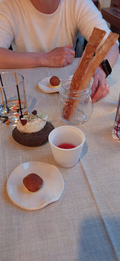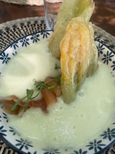 Pranzo fantastico all’esterno, con bella vista sul paesaggio circostante, ottimo anche per trovare refrigerio dal caldo. Partendo da questi ottimi presupposti non mi resta che parlare del cibo: tutto ottimo, impiattato benissimo e di estrema QUALITÀ! Iniziando da un calice di ottimo Lugana come aperitivo, abbiamo poi lasciato scegliere allo chef cosa farci assaggiare. Scelta perfetta, perché ha saputo farci emozionare facendoci i suoi migliori piatti senza che subentrassero i pregiudizi di leggere l’intero menu. Spuma di patate al rosmarino con salmone marinato da loro e fiori di zucca fritti: una spuma densa, saporita e sfiziosa, mi ha stupito molto la consistenza, accompagnata da 7/8 fettine di salmone marinato agli agrumi, piacevolmente morbido e saporito, IL MIGLIORE CHE ABBIA MAI ASSAGGIATO, mi è piaciuto molto come abbinamento…. Avrei voluto non finisse mai. Merluzzo cotto a bassa temperatura con gazpacho di pomodorini, dadolata di mango e porro fritto: questo piatto ha stravolto l’idea che avevamo del merluzzo, l’ho trovato croccante all’esterno ma morbido all’interno, e ammetto che HO AVUTO LA PELLE D’OCA DA QUANTO ERA BUONO. Non aggiungo altro, provatelo assolutamente. A seguire, pappardelle al ragù bianco di anatra e gnocchi con fonduta di formaggio su riduzione di vino rosso, ENTRAMBI PIATTI SPETTACOLARI. Non manca assolutamente il condimento, sono molto gustosi e le porzioni sono perfette. Abbiamo preso una porzione di patate fritte per assaggiarle e ci hanno lasciato senza parole anche loro, croccantissime all’eterno, morbidissime all’interno, molto saporite, hanno sicuramente trovato un OTTIMO METODO particolare per prepararle, mi piacerebbe tanto scoprirlo! Non siamo purtroppo riusciti a prendere il dolce perché eravamo già sazi così, ma torneremo senz’altro per provare anche quello! Prezzo perfettamente in linea coi prodotti e il contesto in cui ci troviamo, anzi visto i tempi di rincari e la qualità estremamente alta che ho trovato nella ricerca della materia prima mi aspettavo anche di pagare di più! Ho infatti trovato i PREZZI DEL MENU MOLTO ONESTI, di conseguenza lo è stato anche il nostro conto. Provare per credere. Non mi resta che dire “A PRESTISSIMO!”, io non vedo l’ora! Grazie Osti Nati per questo fantastico pranzo,...