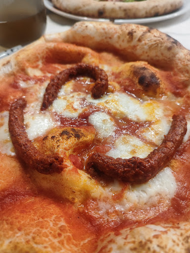 L’esperienza del servizio pessimo ha decisamente messo in secondo piano la bontà della pizza. Oltre che aver aspettato tantissimo sia per gli antipasti che per le pizze, il servizio dei camerieri è stato incommentabile. In primo luogo abbiamo chiesto una pizza bassa e non “verace” dicendoci che potevano farla, quando ci è arrivata verace e lo abbiamo fatto notare la risposta del cameriere è stata “ facciamo tante pizze il sabato non possiamo farle sottili “. Poi abbiamo chiesto dalla CARTA DEI VINI una bottiglia di vino rosso di una cantina ben specifica riportata appunto sul menù. Ci hanno portato tutt’altro vino, addirittura rosato, senza nemmeno farcelo vedere lo hanno aperto. Noi abbiamo fatto notare che non fosse quello che avevamo scelto ma il cameriere ha insistito che avevano solo quello ( cosa non vera perchè successivamente ci è stata portata una seconda bottiglia di quello giusto ) e che ormai era già aperto, addirittura abbiamo fatto notare che quel vino specifico non era nemmeno presente in carta ( percui non sapevamo nemmeno il prezzo! ) ma nonostante questo ci è sempre stato risposto in modo scortese come se non fosse colpa loro. Sul finale speravamo che almeno i 2 caffè e i 2 amari fossero offerti ma non ci hanno scontato niente. Mi dispiace molto perchè la pizza è molto buona ma sul servizio devono decisamente...