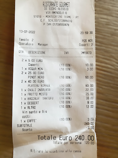 Read moreGran delusione!Avevamo un bel ricordo di questo ristorante, uno dei più noti a Montecatini, non solo per la qualità della materia prima ma anche per la simpatia e professionalità del proprietario e del suo staff. Non so cosa sia accaduto ma la qualità e la preparazione dei piatti non è più la stessa e non giustifica i prezzi, ben al di sopra dell’offerta. A partire dal plateau royal di crudo (consigliata al posto della versione petit) poca varietà e gamberi ai quali non erano state rimosse le budella (gusti a parte, non è piacevole nel crudo). Abbiamo proseguito con un baccalà alquanto stopposo e con una frittura di pesce talmente gommosa e pesante che non sono riuscita a mangiare. Avrei fatto qualche foto ma gli impiattamenti avevano ben poco di gourmet. Niente da dire sull’insalata di ovuli condita al tavolo..molto buona. Tiramisù deludente😞! Dulcis in fundo, Ci siamo ritrovati sul conto una porzione in più di crudo mai ordinato ma purtroppo, ce ne siamo accorti troppo tardi. Il ristorante aveva già chiuso. Che dire…al di là del costo di questa cena (240€ in due..), è stato proprio un dispiacere non ritrovare i sapori e la qualità di una volta. Sicuramente...