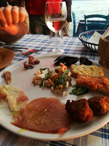 I PRO: il ristorante è proprio in riva al lago e se siete lì per cena la posizione vi regalerà un bellissimo tramonto. C'è un ampio parcheggio sotto l'ombra dell'oliveto. Si può arrivare anche in barca, c'è un moletto di approdo. I tavoli, sotto l'ombreggiante in canne di lago, poggiano direttamente sul suolo sabbioso, il che crea un ambiente simpatico ed informale All'arrivo viene offerto un bicchiere di bianco fresco ma hanno una buona lista dei vini supportata anche dai consigli di (non mi ricordo il nome....) Le ragazze ed i ragazzi del servizio sono stati con noi tutti super cortesi. Ottimi i dolci della casa. I CONTRO Non esiste una tabella prezzi all'esterno, ne sul menù al tavolo sono indicati gli allergeni. C'è una normativa severa sulla questione che pare essere ignorata da quasi tutti gli esercizi in zona e chi dovrebbe controllare evidentemente non lo fa. Abbiamo preso un antipasto (14€) dove probabilmente alcuni componenti erano stati cucinati molto tempo prima, ad esempio la polpettina, seppur non male nel gusto era decisamente secca, (forse il riscaldamento con forno convenzionale ?) che ha sciupato le caratteristiche dell'ingrediente ed anche la quantità complessiva nel piatto mi è parsa un po' scarsa. Poi, se proprio vogliamo fare i pignoli, il vino è arrivato al tavolo quando ormai l'antipasto lo avevamo terminato. Una minimo di cronologia nelle portate, ne andrebbe tenuto conto. Il tonno (16€) come secondo, era molto tenero ma insipido al nostro gusto personale. Avremmo gradito magari qualche condimento anche da usare in opzione. Aggiungo anche il grossissimo problema degli insetti che si verifica in talune condizioni di meteo nelle ore immediatamente successive al tramonto. E' tale da rovinarti il relax di una cenetta, meglio forse aspettare una serata di tramontana o maestrale. IL CONTO Quasi 100 euro in due, considerando antipasto, secondo, dolcetto e vino da 15€, mi è sembrato sproporzionato. Ci è stato addebitato il coperto (5+5€) ma per una normativa regionale so che non avrebbero dovuto farlo. Mah. Evidenzio poi una cosa che mi da ai nervi: ad alcuni clienti che hanno pagato per contanti in fila davanti a noi, non mi pare che abbiano fatto scontrino / ricevuta fiscale. A chi paga con carta, invece si :-(. Non è il caso di commentare...