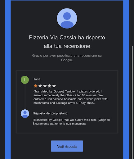 Read moreSono stata lì per il mio compleanno e ho fatto il giro pizza 20€ a persona tutto compreso. Eravamo in 12. "Pizza a volontà" così dicevano... Poi hanno deciso loro quando smettere e ok.. Comunque per il prezzo va pure bene. Durante le portate dell'antipasto non ci hanno portato nemmeno una posata per servirci delle patatine, abbiamo usato le mani. La pizza era talmente fina da essere trasparente e il condimento cadeva tutto, anche il pomodoro scivolava dalla pizza stessa. Una pizza finissima però non male, devo essere sincera. Il servizio lascia a desiderare, le cameriere in "lutto" e praticamente assenti. Ogni cosa che gli chiedevi ti rispondevano a mezza bocca, scocciate, sembrava che dovevano farti un favore. Tempi biblici tra una portata e l'altra! Mi é caduta una forchetta e l'ho dovuta prendere dal tavolo accanto. Se aspettavo loro... La mia torta per 20 persone e mangiata in 12 é stata tagliata in piccolissime parti, che nemmeno l'avessero pagata loro la torta. Richiedo un'altro giro di torta per tutti, visto le sottilissime fette, e me la portano tutta "sbudellata", quel poco che rimaneva. Si la torta era magicamente sparita. Non ci hanno chiesto se andava tutto bene, se mancava qualcosa....addirittura non ci hanno chiesto nemmeno se volevamo prendere un caffè o se volevamo un amaro. Semplicemente ci hanno fatto capire che il servizio era finito e che ce ne dovevamo andare. Siamo andati al bar affianco per prendere sia il caffè che l'amaro. Sicuramente non ci...