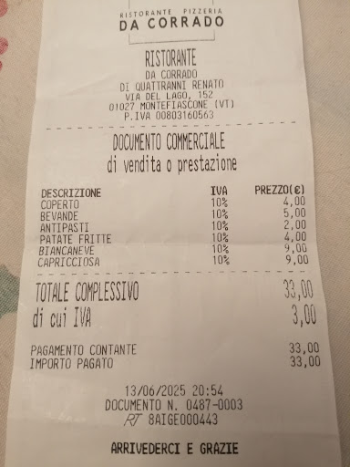 Read moreRiservato a chi, come noi, ama la pizza. In due abbiamo preso 2 suppli, leggermente bruciati e discretamente gustosi, anche se il riso era passato di cottura, accompagnati da una buona patatina fritta. Pizze...una capricciosa per me, senza mozzarella e con prosciutto crudo invece del cotto come da listino e purtroppo si e' rivelata praticamente immangiabile..un impasto sottile, crudo e gommoso con la parte superiore stranamente secca e, come gia' detto, immangiabile...la mia signora una Biancaneve, purtroppo stesso impasto, stessa cottura e stessa valutazione....da circa 25 anni, in genere, quando noi andiamo a mangiare fuori la sera, prendiamo soltanto pizza, questo per dire che ce ne intendiamo abbastanza...e queste possiamo assolutamente dire che sono tra le peggiori pizze che abbiamo mai mangiato. Da bere una lattina di Coca ed una spina chiara piccola di cui non ricordo la marca. Totale spesa € 33.00, prezzo giusto...SE...