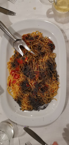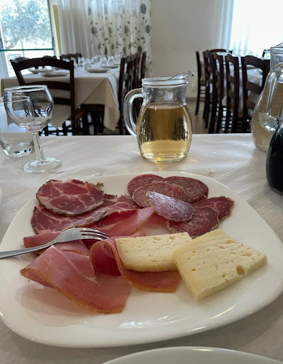 Abbiamo accompagnato il pasto con mezzo litro di bianco sfuso e altrettanto di rosso. Entrambi più che dignitosi. Lo abbiamo concluso con due caffè e la fiaschetta dell'ottimo mistrá della casa, servita di prassi e lasciata in tavola. Vista la reale abbondanza delle porzioni vi consiglio, se prendete l'antipasto, e merita, di ordinare un solo primo e un solo secondo e di condividerli in due. Cosa che noi non abbiamo fatto perché non sapevamo.