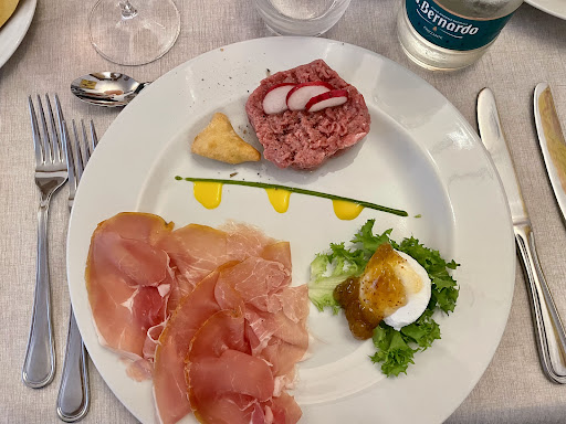Read moreAugust 2024: Wir waren heute zum zweiten Mal im kleinen, aber feinen Restaurant Il Giogo. Von außen eher unscheinbar, überrascht der Innenraum mit Tonnengewölbe, schlicht aber fein eingedeckten Tischen. Alles ist sehr gut gepflegt und ordentlich, die Tischwäsche besticht mit Stoffservietten in hellen Farben, alle Plätze sind mit schönem Besteck und hübschen Gläsern ausgestattet. Für das höchste Fest in Italien, die „Ferragosto“, hatte sich der Küchenchef ein tolles Menü ausgesucht: • SGONFIOTTI CON CRUDO DI CUNEO E TOMINO ALLA COMPOSTA DI FICHI • BATTUTA DI FASSONA • AGNOLOTTI QUADRI PIEMONTESI AL RISTRETTO D'ARROSTO • RISO CARNAROLI ALLO ZAFFERANO E ROBIOLE • TAGLIATA DI TOMAHAWK PIEMONTESE CON PATATE • PANNA COTTA CON COULIS ALLE FRAGOLE Wir haben für das Menü pro Person 40 Euro und inklusive Wasser, einer Flasche Rosé Wein des Weingutes Cascina Terra Felice und zwei Digestifs insgesamt 120 Euro bezahlt. Wir sprechen hier eine ganz klare Empfehlung für das Restaurant Il Giogo aus, ein echter Geheimtipp in einem kleinen Ort nahe Castagnole Monferrato und nur ein paar Fahrminuten von Asti entfernt.