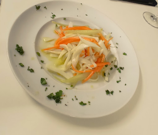 Si mangia discretamente, la location la vedete nelle foto, ha la fortuna di avere, al di là della strada, una piccola piazzola sugli scogli con vista mare. Tavoli e sedie sono di plastica e la mise en plate da pic-nic, il menù è scritto a mano su un foglio di carta per alimenti, ma potrebbe essere anche innovativo. La carta dei vini non esiste. Siamo in 2 e decidiamo di ordinare: Insalata di mare e alici marinate Tagliatelle con seppie e carciofi Gnocchetti con pesce Un fritto misto composto da calamari e qualche gamberetto e dei pesci con le spine. Un dolce Un'acqua minerale Mi voglio soffermare sulla scelta del vino: Parliamo con la cameriera, lei ci propone una bottiglia di vino anonima, visto che la prendevano tutti ed in seguito ordiniamo una seconda bottiglia, questa volta pecorino. Il conto 98euro, scopriamo che la prima bottiglia l'abbiamo pagata 22 euro e la seconda...