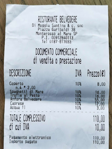 Read more0 Stars! HORRIBLE SERVICE! For some reason we were discriminated on. We were seated at the same time another American couple was. They were waited on and served all their drinks and several courses before we had a drink served. We were polite and tried to speak Italian and thanked her but 45 minutes of waiting while she glared at us as she walked by multiple times, Tried to get her attention to get out drinks and she literally glared and walked by. The couple next to us that was seated when we were ordered a second dish and got it as we stood up and left. I get Italian restaurant time. We were not rude or demanding. But this was extreme and unacceptable. We were recommended here by our hotel. Not only will we tell them not to recommend this restaurant, Restorante Belvedere, we will post on all the travel sights we are on to...