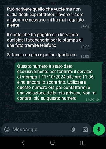 Per fotocopiare un foglio ti fanno pagare 0,50€ a foglio, se ne approfittano essendo gli unici che fanno questo servizio. La fotocopia normale non smartphone sono 0,30€ e non 0,20€. ovviamente i prezzi non sono esposti. aggiornamento recensione in merito all'accaduto del 11/10/2024, nove giorni dopo aver usufruito del servizio. Dopo aver condiviso la mia opinione sui costi offerto in questo bar, il titolare mi ha contattato utilizzando il numero di telefono che avevo fornito esclusivamente per il servizio di stampa (screenshot in allegato). Questo comportamento rappresenta una grave violazione della privacy e un abuso dei miei dati personali. Il mio numero di telefono e il documento stampato, che conteneva informazioni sensibili, avrebbero dovuto essere immediatamente cancellati al termine del servizio, senza essere conservati o utilizzati per altri scopi. Ritengo che tale condotta sia inaccettabile e poco professionale per un'attività che dovrebbe rispettare la normativa per la privacy e la correttezza nei confronti...