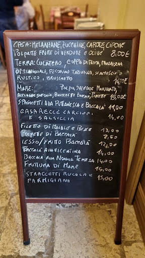 Il cibo è risultato di discreta qualità (prosciutto salato, casarecce amalgamate male e il filetto maiale risultava secco) e le porzioni scarse; l'antipasto di terra da 14 eur prevedeva solo salumi e (pochi) formaggi; per avere qualche verdura bisogna chiedere un altro antipasto da 8 eur (sempre scarso e mediocre).