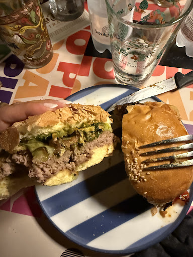 Come panino ho scelto la "Nonna nello spazio", rosetta con hamburger di scottona, fior di latte, melanzane a funghetto, basilico e pesto di basilico.