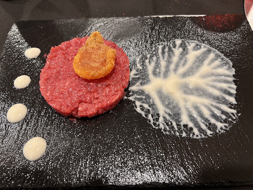 MENU' - In due abbiamo preso: UNA 0.3 DI BIONDA ( PAGATA 3€!!!! ) UNA 0.3 DI ROSSA ( PAGATA 4€!!! ) ACQUA FRIZZANTE 2.50€ ANTIPASTI 1- Carpaccio di Manzo con pistacchio, Tartufo nero a scaglie e caprino; ( 10 €) 2 - selezione di salumi ( e qui non parliamo di classico crudo e salame, ma parliamo di salumi ricercati ) 10€ ! 3 - Tartare di scottona con tuorlo croccante e fonduta di parmigiano...9€