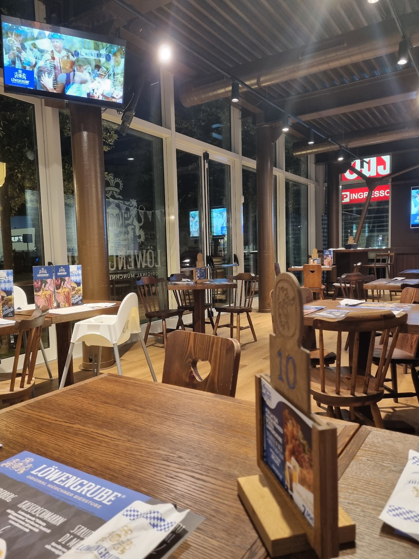 Ambiente in tema con l'aria tedesca del brand ma la musica.... un po' ripetitiva. Siamo stati lì meno di un'ora ma comunque ha dato un po' alla testa. Sulle televisioni in sala apparivano sempre le stesse immagini e di sicuro non aiutavano con l'aria monotona instillata dall musica tedesca.