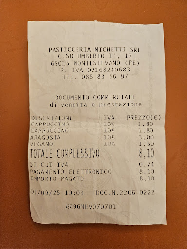 Read morePessima esperienza per tanta professionalità vantata e fatta pagare ma con risultati, nel mio caso, molto deludenti. Per i dipendenti della mia azienda decido di prendere dei panettoni artigianali sperando in un regalo natalizio gradito e diverso dal solito recandomi in una pasticceria della zona “rinomata” quale conosciuta come “michetti” non badando nemmeno al prezzo, peccato che nell’aprire la confezione che mi ero gelosamente riservata a casa di parenti per di più la sera di capodanno dopo il cenone come dolce , mi trovo un panettone che di artigianale ha ben poco e con dei gusti che non ci azzeccano nulla con quelli scritti sull’etichetta esterna. Il panettone che doveva essere integrale con noci, fichi e miele ( scelto appositamente per intolleranze varie dei famigliari alle classiche uvette) si è rivelato invece un classico panettone, a mio avviso neanche artigianale, con uvetta e canditi. Pessima figura la mia difronte ad un disguido (spero) che non sarebbe dovuto accadere in un locale così rinomato dove la professionalità andrebbe dimostrata anche in queste piccole cose. La mia recensione negativa giustifica il disappunto sul fatto che era troppo tardi per rimediare alla pessima esperienza difronte ai famigliari ma anche l’incognita per gli altri panettoni tutti di gusti scelti perché particolari che ho regalato ai dipendenti di cui non saprò mai il vero...