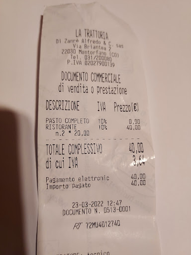 Bello e furbo il personale. Ti leggono delle cose (..non ti presentano il menù cartaceo..!!!!!) facendoti credere che ti servono un menù fisso a pranzo..!! Ma loro non fanno il menù fisso e quando vai a pagare ti accorgi della sorpresa..!!! Posto da evitare, specialmente a pranzo!!! Qualsiasi TRATTORIA che rispetta i clienti ha un menù fisso a pranzo nei giorni feriali.. ..ma non qui..!! Loro fanno solo "menù alla carte" ma "si dimenticano"(..che strano..) di presentarti "la carte", così ti fregano quando devi pagare..!!! Qualità? Molto più bassa di una vera TRATTORIA..!! 🤷 In risposta al proprietario..: "pasta fresca" da voi..??!? 🤣 Non si preoccupi! Non tornerò mai più così come altre centinaia di persone della zona di Alzate e dintorni..!! Ecco perché "soffia il vento" nel vostro ristorante.. Sono un autista della zona e vi farò una bellissima pubblicità..! 👍 Avete un voto di 3,6 su Google e parlate di pasta fresca..?!?? Nemmeno i vostri amici riescono a far aumentare il voto.. 🤦🤣 Chi sa quanto è in regola il vostro...