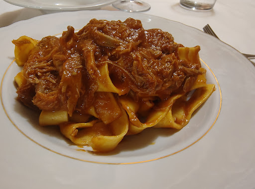 …………………………. non vedevamo l’ora di tornare da Gianluca al Porcellino e quando si è presentata l’occasione non ce la siamo fatta sfuggire Ho chiamato e il nostro tavolo sotto il pergolato era pronto ad attenderci e dopo i saluti di rito, Gianluca è diventato proprio un caro amico nel corso degli anni, ci siamo messi a tavola Le portate si sono succedute con la cadenza e la bontà di sempre e incominciando dal gran tagliere di salumi tipici e di formaggi locali, proseguendo con la ricotta e tartufo bianco, l melanzane grigliate, le mitiche pizze fritte, il roast beef con l’insalatina di pomodori, la panzanella di pomodori, cetrioli e cipolla, le patate al forno farcite di salsiccia, il sempre ottimo formaggio fritto Il vino della casa, un fantastico rosato della cantina di Manuel Casimirri, eccellenza della zona è scorso a fiumi e anche se uno di noi era astemio, l’abbiamo convinto ad assaggiarlo Poi siamo passati alla scelta dei primi e quindi, fettuccine con ragù di cinghiale e trofie con i funghi porcini che come al solito hanno portato in tavola sapori e materie prime di eccellente qualità Non potevamo far assaggiare all’ospite d’onore le costolette d’agnello di Gianluca, must nel nostro pranzo da lui e anche se sempre quello astemio di prima, non le voleva assaggiare, ……….. no a me l’agnello non piace, ….. poi si è convinto della loro bontà Le patate fritte come le faceva mia madre sono poi insuperabili, assolutamente da gustare e non farle mai mancare a tavola con le costolette Le sue costolette sono imbattibili e ormai non possono più mancare nei ns. pranzi al Porcellino Poi, l’astemio, goloso, ha voluto prendere la pizza dolce, tipica specialità di dolce abruzzese, una sorta di zuppa inglese rivisitata che era fantastica X chiudere abbiamo fatto assaggiare all’astemio, anche la ratafia che non aveva mai bevuto e devo dire che anche qui abbiamo vinto Grande Gianluca Ristorante del cuore...