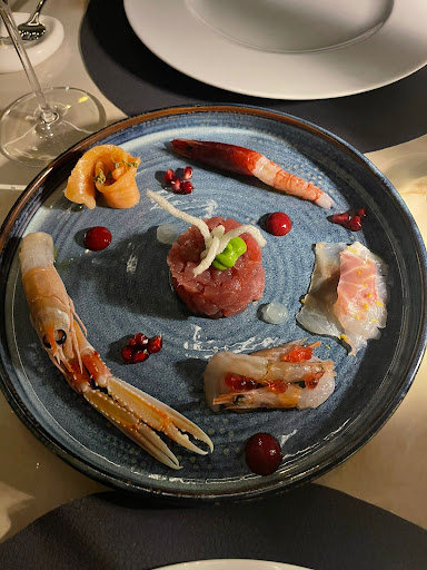 🤵🍝 Servizio eccellente sin dai primi momenti quando, dopo aver scelto la bottiglia di vino grazie anche all'aiuto di uno dei titolari (direttore di sala), ci è stato servito un arancino di riso, patate e cozze rivisitato secondo la loro cucina. Come antipasto abbiamo scelto una sublime degustazione di crudi di pesce con accostamenti incredibili come la riduzione di melograno. Nei primi la fa da padrone la pasta fresca, la tradizione e la competenza della chef Maria Rosaria Peluso: orecchiette alle cime di rapa e acciughe e tagliolini al burro Occelli e tartufo nero (super profumato!). Come secondo in condivisione un filetto di manzo con fondo bruno e sottobosco cotto in modo eccezionale e servito come fosse un quadro. Il dolce, spettacolare, ci ha decisamente sorpresi.
