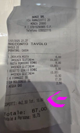 First, we were charged for drinks that were supposedly included in the kids' meal, and when we questioned it, the staff wasn't very accommodating. To make things worse, we were also charged €2.50 per person for a cover charge ("coperto"), even though we didn’t receive any bread, olives, or starters, something we hadn’t encountered at any other restaurant in Italy during our trip.