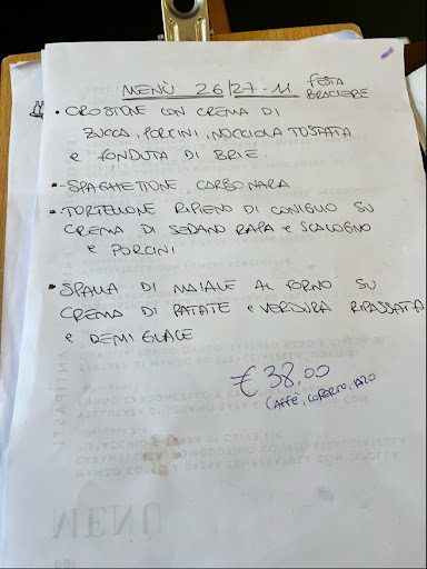 Nice little trattoria in the heart of a medieval borgo (Moresco) nearby Fermo, Marche. Today, prix fixe menu (see picture; there was an ongoing town festival) including an appetizer, two choice of pasta and an entree. We picked a local rosso Piceno to accompany our tasty meal. Service was friendly and efficient (despite some past posted negative reviews). All was very good and very authentic with a touch of modernity. A place to stop-by while visiting this small but beautiful typically Marchegian...