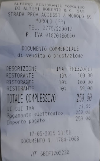 Read moreDue stelle di incoraggiamento per questo modesto ristorante che ha investito più nella ristrutturazione dell'arredamento (carino) che nella formazione dei camerieri (del tutto improvvisati) e dei cuochi soprattutto. Antipasto all'italiana contenente un prosciutto completamente insapore, due ciliegine di mozzarella da vaschetta di supermercato (siamo o non siamo a 10 min da Amaseno e le sue bufale???!!!😠) una crocchetta di patate surgelata e freddissima, un'oliva all'ascolana vicina parente della crocchetta (me le mangio a casa a 20 centesimi l'una, grazie). Primi onesti anche se i paccheri con il cacio di Morolo (finalmente qualcosa di locale) erano decisamente troppo cotti, ed i secondi di carne piuttosto buoni per quanto riguarda abbacchio e bistecca; male la salsiccia troppo cotta e quindi asciutta, ma meglio del pessimo coniglio alla cacciatora: tre pezzetti di petto stracotti, stra-asciutti, senza pomodoro, senza olive, senza alloro, insomma senza nulla. Coniglio essiccato in padella difficile da mandar giu'! Sbaglierò io, ma "alla cacciatora" dovrebbe essere ben altro! Solo gli uomini menù completo, donne e ragazza una portata di meno, due bottiglie di vino locale e tre dolci in sette... 32 euro a persona di...