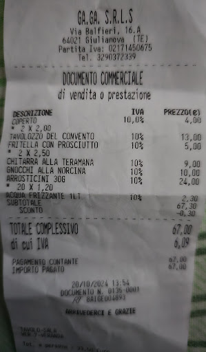 Read moreSiamo stati in questo ristorante per pranzo avendo pattuito prima il menù ed il prezzo a persona con la titolare. Nel momento del preventivo ci è stato detto che fare il menù bambini generalmente è uno spreco perchè gran parte delle portate non vengono consumate, così ci propone 37€ a persona e ci dice chiaramente che i bambini (4) non avrebbero pagato dal momento in cui avrebbero stuzzicato solo gli affettati (così è andata!). Al momento del pagamento, abbiamo pagato 37€ a persona. Compresi i bambini. Praticamente un "menù bambini" da TRENTASETTE EURO. 37€ per 2 fette di prosciutto e mezza porzione di chitarra alla teramana!