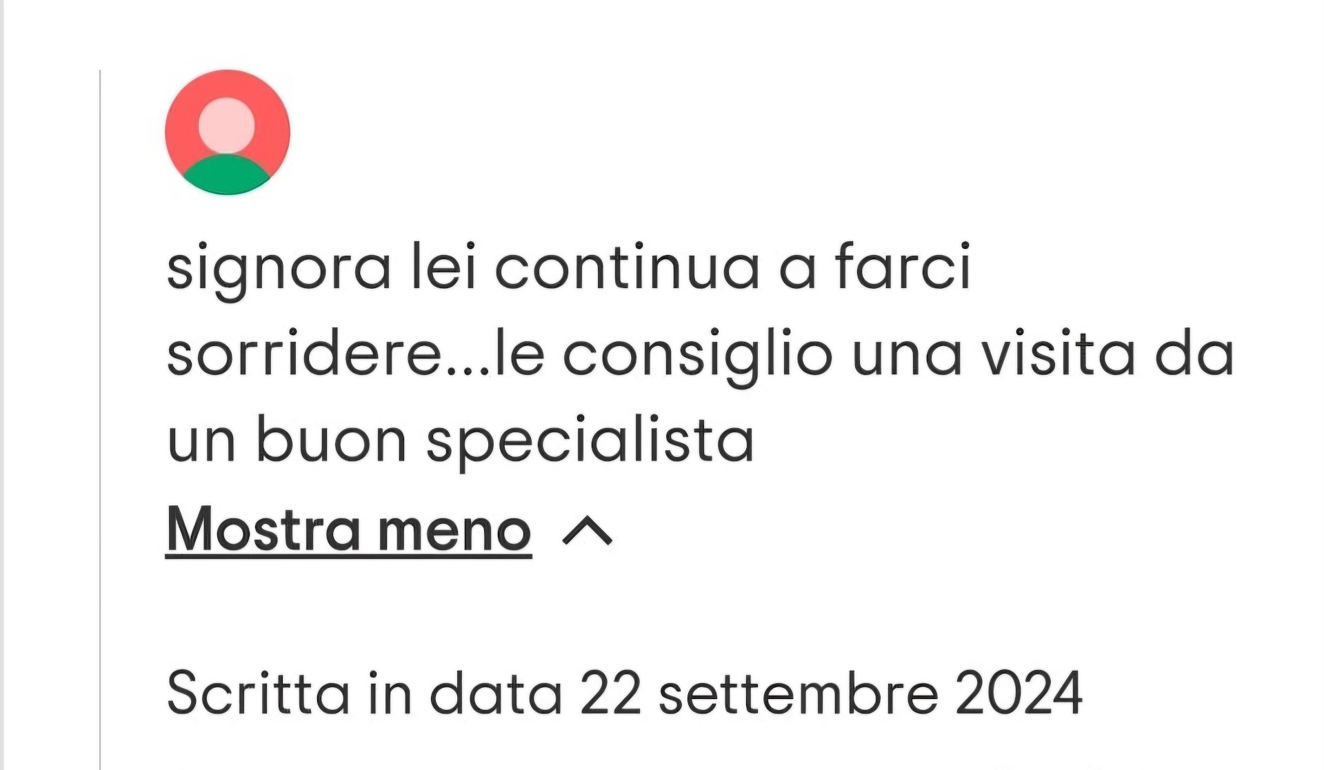 Read moreEsperienza terribile. Quando ho chiamato per prenotare, ho fatto presente che, per seri motivi di salute, avrei potuto mangiare solo cibi cremosi e che sarei stata a cena con un'amica celiaca. Mi hanno risposto (gentilmente) che avrei dovuto adattarmi a ordinare solo le creme già pronte che hanno di contorno ai piatti. Ho accettato tranquillamente sottolineando che mi sarei resa disponibile a pagare il prezzo pieno anche per porzioni mini. Una volta a cena, abbiamo aspettato più di un'ora per avere da mangiare (io con una forchetta sporca davanti) e in più per la mia amica celiaca non c'erano né pane né contorni di alcun tipo (previsti dal menù, ma della cui mancanza non è stata avvertita e di cui è stato preteso in seguito il pagamento). A me hanno nel frattempo detto apertamente che stavo creando molti problemi (falso: mi hanno servito salse già pronte, che hanno solo impiattato diversamente). Fatte le rimostranze a cuoco e proprietaria, il cuoco ha alzato la voce ripetendo prepotentemente che avrei potuto ordinare carne o pizza come tutti poiché stavo rallentando la cucina e la proprietaria ci ha riso in faccia e ci ha detto che non saremmo dovute uscire di sabato sera se abbiamo tutte queste intolleranze e che loro non fanno fuori menù poiché tanto di clienti ne hanno, per poi cacciarci letteralmente dal locale quando abbiamo chiesto se fosse giusto pagare quanto mai servito senza preavviso né alternative alla mia amica. Abbiamo pagato lo stesso perché almeno noi siamo persone corrette. P.S. Aggiungo uno screen che mostra l'educazione e il livello culturale...