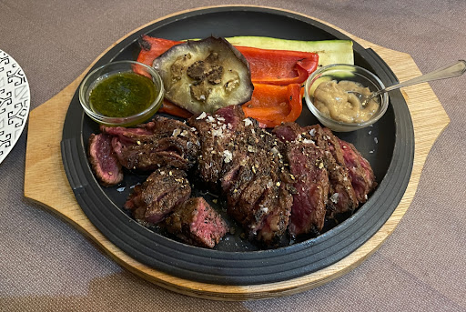Per il piatto principale, non potevo non andare sul classico: una steak di Angus con verdure grigliate. Cottura media, come richiesto – tenera dentro e con quella crosticina e spezie fuori che grida “carne fatta bene” con orgoglio. Le verdure? Non il solito contorno buttato lì per placare la coscienza: grigliate a puntino, saporite, con un retrogusto affumicato.
