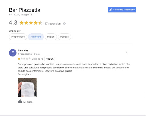 In risposta al sig. ELEO MAS che ha recensito negativamente il Bar Piazzetta (vedi foto in allegato): Se il Suo carissimo amico NON avrebbe appoggiato il casco su di un tavolino di appena 60x60 cm. di lato senza guardare minimamente dove lo metteva, spingendo il portacenere giù dal bordo (visto che i tavolini sono fatti per appoggiarci i bicchieri, i posacenere e le varie cose che si usano in un bar) l’oggetto in questione NON sarebbe caduto e NON si sarebbe rotto. La cosa che mi ha dato più fastidio caro Sig. ELEO MAS, essendo testimone dell’accaduto e che ho segnalato alla titolare del bar, è che invece di prendere i cocci, recarsi da lei e segnalare l’accaduto (che conoscendola sicuramente avrebbe lasciato correre e non vi addebitava gli 8 euro del portacenere, tra l’altro fatti fare da Lei, non quelli in vetro che vengono regalati dai fornitori) il Suo amico, ha chiamato il ragazzo dicendogli di raccogliere i cocci e come non bastasse sghignazzavate e ridevate come dei “gabbiani” dell’accaduto. Questa è una cosa di cattivo gusto che mi ha dato personalmente molto fastidio caro Signor ELEO MAS e amico… Ma va bene così, molto probabilmente, certi clienti si eliminano da soli....