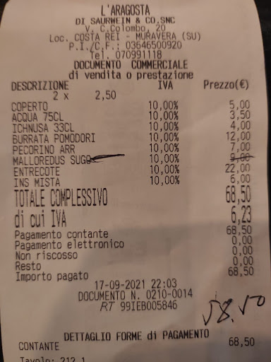 Read morePurtroppo pessima esperienza. Il cameriere che ci ha servito sembrava visibilmente confuso e poco preparato. Gli chiedo come sono i malloreddus alla campidanese, mi risponde che sono "una pasta con del pomodoro, signora", gli ribatto che sul menù c'è scritto che il sugo è a base di salsiccia alchè mi risponde, sí, pomodoro con la salsiccia. Per ribadire il concetto gli ribadisco che non voglio un piatto di pasta al pomodoro (me lo preparo anche a casa mia) e lui conferma la comanda.