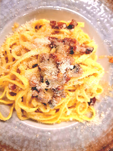 Come benvenuto ci hanno omaggiato di alcuni frittini davvero sfiziosi. Abbiamo optato per i Primi della settimana , dei Paccheri con vongole e crema di pistacchio,davvero buoni.