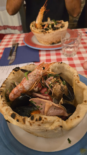 A great place for both pizza and other traditional Neapolitan dishes (such as "zuppa di cozze", with mussels, octopus and tomato, or the "panariello" in the attached pictures: a basket made with pizza dough, baked and filled with linguine with seafood). A great variety of traditional and less common pizzas appears on the menu, together with many delicious starters, first and second course dishes and desserts. A nice selection of wine and beers accompanies the menu. The staff is friendly and the atmosphere and restaurant decor is very jovial. Definitely...