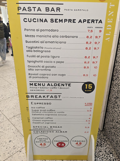 Read moreAte here between trains from Rome to Naples and then Naples onward to Sorrento and was extremely pleased with the level of service. My grandfather got a small pasta dish, which he enjoyed. I also got a small pasta dish, although it wasn't what I was looking for, so I asked them if I could get something else and they very happily obliged, providing a fresh and delicious salad which really hit the spot! Considering there is a McDonalds near by, as well as some other establishments that seemed to be lesser quality, I'd definitely recommend grabbing a quick bite and beverage at ALDENTE Pasta Bar over the other options at Napoli Centrale...