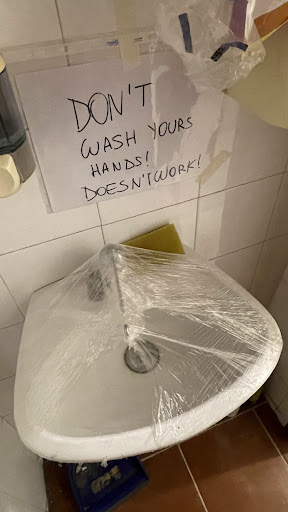 The mismatched plates and cutlery gave things an unintentionally humorous touch. But what really made me laugh (in disbelief) was the state of the bathroom: one toilet was broken and lying on the floor, and although there was a second one, the sink there wasn’t working.