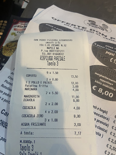Read morePizzeria da evitare assolutamente. Cara, un prodotto scadente e il servizio lascia molto a desiderare. Abbiamo pagato 51 euro per mangiare tre pizze gommose e una pizza fritta che più che fritta era stata ammollo nell'olio. Quasi tutte le bevande erano fuori menù e le porzioni scarse. Oltrettutto danno del falso al cliente che non si è trovato bene dimostrando in pieno la mancanza di professionalità e di serietà del proprietario. Chiedilo alla signora che mandi in giro ad accaparrare clienti con la promessa del pranzo a sei euro chi sono e vedi che se lo ricorda. Ma che strano!!!! A distanza di 24 h è tornata la memoria al proprietario della pizzeria don Pedro!!! Le pizze erano tre tutte da menù e l'insalata, che prima dici di non servire e poi ti ricordi che l'hai improvvisata, era scadente e di pessima qualità. Le persone che creano problemi sono gli approssimativi come te. Il problema è che nessuno denuncia che mandi in giro una persona a promettere pizza e bibita a 6 euro e poi presnetini conti da 12,50 a persona. Di questo, naturalmente, ne pagano tutti i napoletani, soprattutto quelli che cercano di lavorare...