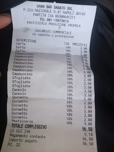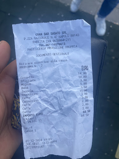 Read moreSono capitata nella zona della ferrovia, avevo voglia di un dolce e sono entrata nel bar sabato, attirata dalla ben curata facciata e dalla possibilità di parcheggio. Il Gran Bar Sabato offre ai clienti una grande varietà di pasticcini di ogni tipo ed è un luogo molto apprezzato per le birre e gli alcolici sui quali c'è una seria competenza. Il personale è molto gentile anche a tarda sera. ( erano quasi le 24 quando sono entrata) la cosa di cui mi sono meravigliata è stato l'ampio assortimento di cibo, essendo incombente la notte. I prezzi sono...