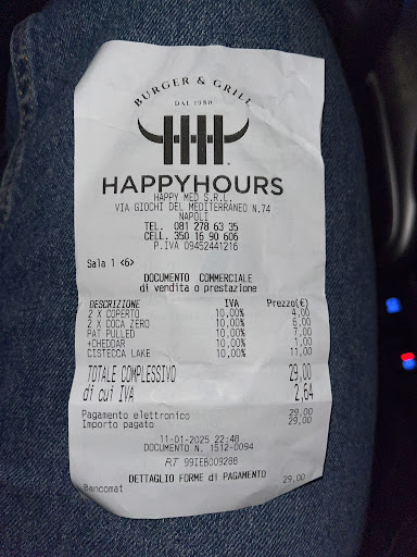 Read moreLo scorso fine settimana ho avuto il piacere di provare HappyHours a Fuorigrotta insieme ad alcuni amici, e devo dire che è stata un’ottima scelta per una serata conviviale. Il locale è accogliente e abbastanza spazioso, e anche se era davvero affollato, siamo riusciti a trovare subito un tavolo dove accomodarci senza problemi, il che è stato un bel vantaggio. Il personale è stato un altro punto forte della serata: gentile, simpatico e sempre disponibile, rendendo l’esperienza ancora più piacevole. Nonostante il gran numero di clienti, il servizio è stato veloce, il che è sempre apprezzato. Passando al cibo, i panini sono davvero il punto di forza di questo posto. Ci sono diverse opzioni in termini di forma e dimensione: i classici panini rotondi da burger erano incredibilmente soffici e leggeri, e nonostante fossero grandi e ben farciti, si mangiavano con facilità. Io ho scelto uno di questi e sono rimasto colpito dalla morbidezza del pane, che ha reso ogni morso davvero piacevole. La mia ragazza ha provato invece un panino allungato, che era leggermente più duro e tostato. Anche se un po' più croccante, l'ha trovato buono e ben riempito. Tutti i panini erano abbondanti, con ingredienti freschi e di qualità, il che ha reso il rapporto qualità-prezzo decisamente positivo. I prezzi sono nella norma per questo tipo di locale, quindi niente di eccessivo, soprattutto considerando la qualità e la quantità del cibo offerto. In sintesi, HappyHours è stata una scoperta davvero positiva: un locale sfizioso e amichevole dove mangiare bene, con un servizio ottimo e un’atmosfera accogliente. Sicuramente lo consiglio a chi è in zona e ha voglia di un buon panino...