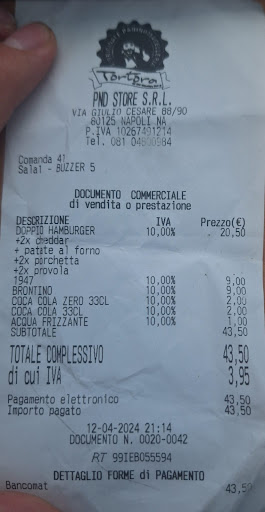 Read moreArriviamo al locale e guardiamo i prezzi tramite il Menu ufficiale online di Mario Tortora ordiniamo 3 panini: Super nunzio prezzo 9€ Brontino prezzo 9,5€ e Santiago prezzo dal loro listino ufficiale 13€ 2 Coca cola zero 2€ e una bottiglia D'acqua frizzante 1€. Totale avrei dovuto pagare 36€ essendo la prima volta che andavamo non sapevamo i prezzi e il ragazzo dietro la cassa mi dice 43,50€ pago con carta mi rilascia lo scontrino fiscale, vado a controllare e vedo che un panino ovvero "Santiago" sullo scontrino il prezzo era segnato 20,50€ gli dico scusami ma sul menu online che abbiamo visto il prezzo del panino era 13€ qui l'ho pagato 20,50€ com'è possibile? Risposta del ragazzo: "Eh ma i prezzi del menu online sono vecchi io l'ho fatto direttamente dalla cassa e il prezzo è quello. Ovviamente in quell'istante gli ho detto scusami io allora non voglio piu' il panino in quanto non sono disposto a pagare una cifra maggiore rispetto a quella che ho visto sul vostro menu!! Lui mi risponde che ormai non può fare nulla e che i panini erano già pronti. Morale della storia sono praticamente stato derubato da questo locale. Non è per i pochi euro ma per la scorrettezza e per il sovraprezzo del panino, tra l'altro 20,50€ un panino che ne valeva 5€ ed era pure tanto. Ho frequentato i migliori Pub di Napoli e non ho mai pagato 20,50€ per un panino assurdo!! Sicuramente non ci...