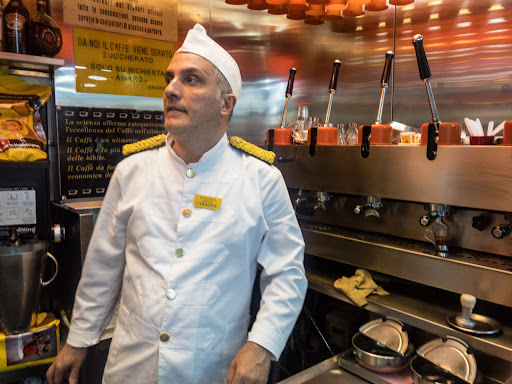 We went into this place to have a quick coffee to go after lunch. We paid for 2 coffees and went taking the coupon to the man making the coffee. He was the most rude person i have met, talking to me in italian i said super kindly, sorry i dont understand. He took the cups annoyingly and started slapping them very annoyed when i said this and then starting shouting in italian. The lady at the cash told us for aitting down u have to pay service. I said we will gladly pay that but whats his problem waving and muttering italian words to our face? What an ugly experience and an ugly spirited man....