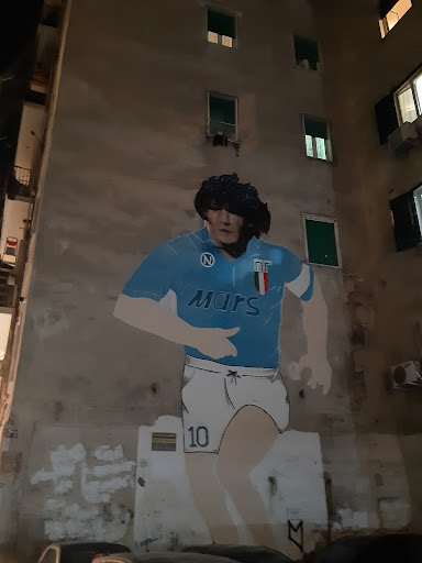 Nous sommes tombés par hasard à la nuit tombée sur ce lieu populaire à Naples qui rend hommage à Diego Maradona (dieu vivant pour les napolitains) ayant amené le club de foot du SSC NAPOLI dans les années 80 à ses plus belles heures de gloire!! Situé dans les ruelles hautes du quartier espagnol, il y est indiqué à quelques endroits mais il faut tomber dessus!!