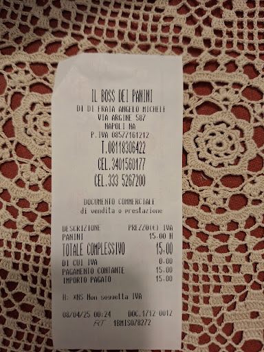 Read moreEeeh ragazzi dal boss dei panini non puoi non fermarti. Panini eccezionali, belli pieni, ci puoi mettere di tutto e soprattutto si spende il giustooo. Tutti i prodotti utilizzati sono freschi e di qualità. Per le consegne a domicilio è precisissimo, anche il sabato!!! "Si ve vulite arrecriá, add'ò Boss de Panini...