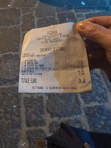 Told us what to order without giving us a menu. We had to ask for the menu after we ordered a margherita pizza and a cuoppola so that we could know the price. When the bill came, he charged us extra for cover (1.5euro each) even though it wasn't on the menu, and he didn't give us bread. He also charged 10% servizio on the bill without telling us. See photo. We got a margherita, but he charged us for a bufalina, which was 2.5 euro more. The total was 26.40euro, but he typed in 30 euro into the machine. We told him no. He brought the bill and the machine and rushed us to leave so we didn't have time to check thoroughly.