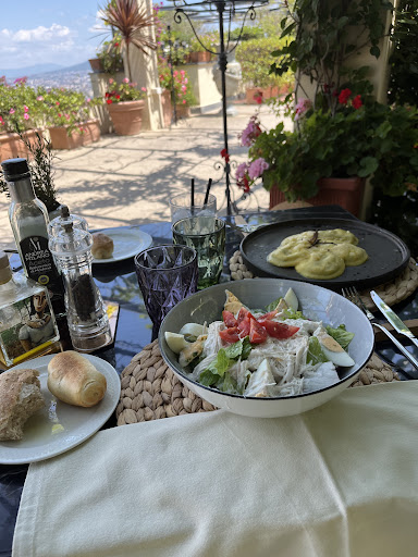Read moreTasty ravioli with eggplants and recommended tasty pulled chicken salad. Fresh and savory vegetables. Amazing spaghetti chitara pasta with vengole (italian name for clams). Lovely terrace with tables under a wild mulberry’s tree for lunch right side of the pool on the 7th floor. Nice place to have lunch especially for the Vesuvius view and the friendly service. Toilets available on the other side of the pool. We had lunch on the 7th floor and the dinner is served on the 4th floor. Amazing lobster Couscous and tasty amuse-bouches. The bread is not freshly baked, the sea food not well cooked so I do not recommend the cuttlefish dish and the avocado in the starters dish not mature but they offered us a welcoming Prosecco and amuse-bouche and also one dessert and coffee. That was a nice gesture. Lovely dinner place with fireworks visible down in the city and talented piano player, tasty aperitifs snacks and cocktails. Lovely atmosphere. Dinner tables are on the fourth floor in the same location...