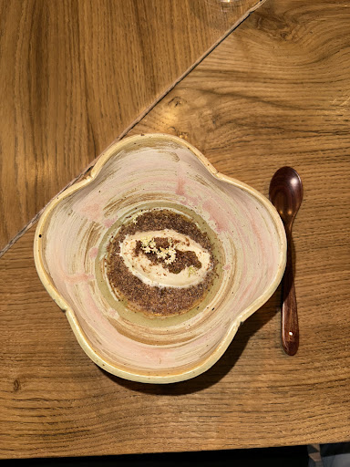 Dessert Albicocca al binchotan torroncino al sesamo e cioccolato bianco caramellato L’insieme dei gusti nel dessert e’ perfetto, il torroncino si lega perfettamente al gusto morbido dell’albicocca.
