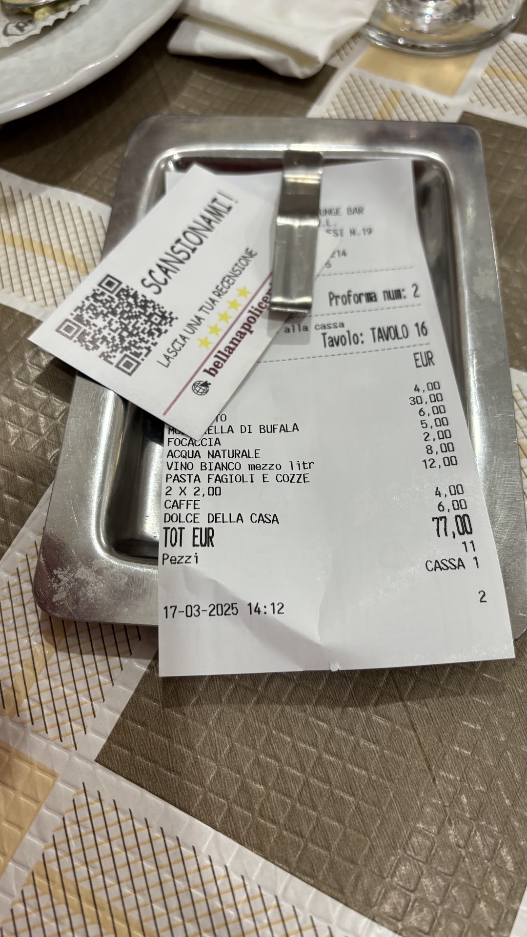 Read moreMy husband and I went to this trattoria some days ago. The vibe seemed nice, so did the staff. We heard the advice of the owner regarding what to eat and order their “house antipasto”, when we asked what does it had, the first thing he said was “mozzarella, and a mix of “mare” and “terra” typical dishes. Then, when we asked for the bread, he gave us a focaccia instead. We also ordered a first dish, dessert and even coffee. The food was good in general and as I said before, they seemed kind. But unfortunately when the owner gave us the bill, we noticed with disappointment that the “mozzarella” and the “focaccia” were outside the “antipasto” and the “coperto” respectively. We told him our concern and let him know that we didn’t even ordered the “focaccia”. He never even mentioned it had an extra cost or cared to ask if we would like to have it so we assume it was there as part of the appetizer or instead of the bread. We end up paying for a 30 Eur antipasto + 6 EUR for a small mozzarella + 5 EUR for the focaccia + 4 EUR for the coperto. We felt he took advantage of the situation and found his reply “thanks for the advice” in a totally sarcastic and rude manner totally inappropriate. I would recommend to watch out for what you order and to check the bill twice as we found this person quite misleading. The food was nice but there are plenty of nice food trattorias in Napoli with best manners from the staff and above all, without wanting to take advantage...