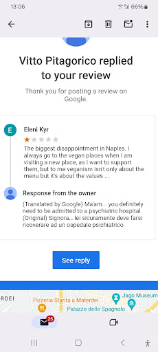 When Love each other is only marketing On our last day in Naples, we had lunch at the vegan restaurant Vitto Pitagorico. Nothing to complain about the quality of the food or the service provided by the staff, but a comment on the behaviour on both the human and business side has to be made. At the end of our lunch a homeless man approached our table and asked if he could eat two olives left on our plate. When I asked if he was hungry, he told me that he had not eaten for days. I therefore told him to sit at our table because he would be our guest. He thanked me but wanted to sit alone at the adjacent table. Ii has to be said that the tables were outside under the vaults of a public passage. I therefore told the waiter to bring him what he wanted, I would pay for the order. The man just ordered a simple pizza. So far nothing abnormal When the pizza arrived, the owner extremely rudely chased the man away, even grabbing him by the arm. At my remonstrances and since I was paying the bill, a heated argument ensued. My daughter was shocked and burst into tears and even called the owner one word too many. For this I apologise because it is not the upbringing we have given our children. The emotion of seeing someone treated like that, set off the springs of a young person with little life experience. The same thing, however, happened to the owner who is neither young but runs a Restaurant . Attacking customers, shouting at them to take the homeless to their homes gives her neither honour nor respect. At most he will lose more customers. I strongly advise the owner to remove the inscription on the inside 'LOVE EACH OTHER' as this is an affront to humanity and unwary customers to read the negative reviews and you will get a clear picture of the personality of the gentleman in question. As an executive of a big Company I would advise you to review your behaviour. And while I could understand some of your arguments, it would have been easy to turn a blind eye at the time to react differently after the customer left the premises. You would have had a satisfied customer, sold an extra pizza, received a positive review, and instead? I notice that you have already responded to other customers on our behalf. I can assure you that this is our first writing. But there were other customers in the restaurant who witnessed the scene. Although I know that my writing will probably only serve to incite you to reply to me in your usual manner. I look forward to your reply so that I can send it to the local tourist board. However, I wish...