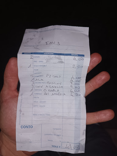 Read more🇮🇹 Salsiccia per lo più grassa e mal cotta Costine di maiale solo grasse e non differenti da delle costine qualsiasi tipo OldWildWest Involtini di agnello vecchi Olio di oliva di qualità simile a quella di un supermercato (un esempio di olio buono extravergine di oliva pugliese è quello di Oleificio Cooperativa Riforma Fondiaria Nardò) Cicoria cotta vecchia di qualche giorno e pagata più salata di quanto non lo fosse realmente 4€ di coperto per 2 crani. Attesa molto lunga con pochi clienti serviti.