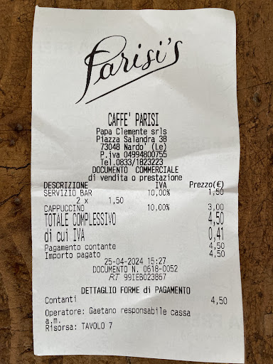 Scam! They made us pay 50% “bar service charge”! We ordered two cappuccinos inside at their bar, for EUR 1,50 each according to their menu. The waitress told us to sit outside, she would bring our order. The cappuccinos were fine, but when we walked in afterwards to pay the total of EUR 3 (plus a tip, of course), the super unfriendly guy behind the counter demanded EUR 4,5 - thanks to a ridiculous “bar service charge” which none of the cafes we visited during our 3+ weeks all over Italy (and there were many!) ever dared to ask! Unfortunately, we only saw later from the many bad reviews here (filter for “lowest score”) that this is the usual scam of this place. Well, we’re in town for a couple of days, and this bar will certainly never see us again. If you consider visiting Caffè Parisi, better stay away and choose one of the honest...