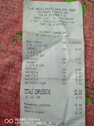 Read moreFidandomi del mio istinto ho preferito allontanarmi leggermente dal cento e di fermarmi nel primo ristorante che "mi ispirava" e anche questa volta ho fatto benissimo!|La vecchia volpe è un ristorante a conduzione |familiare gestito da marito e moglie: il signor Fernando e la signora Lucia che ho fatto chiamare dalla cucina per complimentarmi! |Vasta la scelta sia di piatti caldi che freddi di terra e mare come vasta la qualità di pizze (non c'è la possibilità di scegliere farine integrali ma per chi vuol restare più leggero si può chiedere un impasto più sottile)|Cordialità, sorriso e disponibilità da parte di tutto il personale nell'illustrare il menù e nel servire i piatti sono la cosa che fa di questo posto un posto speciale. |Ottima anche la selezione dei vini ma in salento e' difficile sbagliare ;)|Porzioni abbondanti e piatti ben presentati in un ambiente pulito ordinato e decisamente familiare nel rispetto del luogo e dell'ospitalità dei suoi abitanti.|Se vi recate in salento visitate Nardò che è un gioiellino e prima di passare per il centro storico, in prossimità dello stadio, mangiate un boccone a pranzo o a cena in questo posto dove si respira l'atmosfera casereccia che ormai è andata persa nei freddi ristoranti moderni! |Ottimo il rapporto...