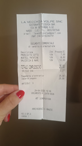 Fidandomi del mio istinto ho preferito allontanarmi leggermente dal cento e di fermarmi nel primo ristorante che "mi ispirava" e anche questa volta ho fatto benissimo!|La vecchia volpe è un ristorante a conduzione |familiare gestito da marito e moglie: il signor Fernando e la signora Lucia che ho fatto chiamare dalla cucina per complimentarmi! |Vasta la scelta sia di piatti caldi che freddi di terra e mare come vasta la qualità di pizze (non c'è la possibilità di scegliere farine integrali ma per chi vuol restare più leggero si può chiedere un impasto più sottile)|Cordialità, sorriso e disponibilità da parte di tutto il personale nell'illustrare il menù e nel servire i piatti sono la cosa che fa di questo posto un posto speciale. |Ottima anche la selezione dei vini ma in salento e' difficile sbagliare ;)|Porzioni abbondanti e piatti ben presentati in un ambiente pulito ordinato e decisamente familiare nel rispetto del luogo e dell'ospitalità dei suoi abitanti.|Se vi recate in salento visitate Nardò che è un gioiellino e prima di passare per il centro storico, in prossimità dello stadio, mangiate un boccone a pranzo o a cena in questo posto dove si respira l'atmosfera casereccia che ormai è andata persa nei freddi ristoranti moderni! |Ottimo il rapporto...