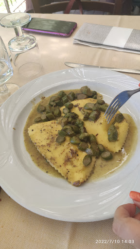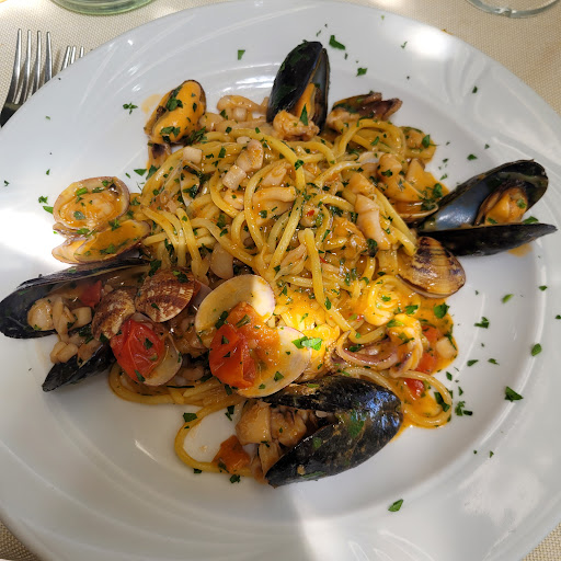 Stopped here on our way down to Naples from Assisi, we wanted to avoid an autogrill for lunch and came across this place about 10 minutes off the highway. It was perfect! Nice local spot even in off season, they had a lot of specials and both a surf and turf menus available. We arrived and the grill was a blaze, with giant porcini mushrooms in a basket next to the old golden retriever that greeted us upon arrival. The space, obviously dog friendly had a great view of the Tiber River below and a really imaginative decor! We had fresh Ricotta cheese with honey and almonds, mozzarella di bufala and the fried calamari and shrimp as a starter and it was all delicious with our beers and wine. For lunch I had some sausages with romanesco done up with olive oil garlic and crushed red pepper, my partner got the swordfish, with roasted dandelion greens and my parents shared a fresh crab pasta, everyone enjoyed, the staff was very friendly and warm, would...