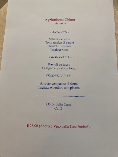 Agriturismo Chiara ..via Arzeno 41 ..Arzeno provincia di Genova . Ci troviamo sulla fascia collinare tra Chiavari e Lavagna ..in un locale molto accogliente..con del personale gentile e sempre disponibile per qualsiasi evenienza . Qui a tavola ti vedi arrivare delle portate molto abbondanti e di ottima qualità, il menu" e sempre vario e fin troppo gustoso , accompagnato da buoni vini e ottimi dolci . .sul finale . Direi che a fine pranzo o cena si rimane pienamente soddisfatti ..e c'e" solo da fare dei meritati complimenti al proprietario. IL prezzo devo dire e" fin troppo onesto ..si va dalle 20 ..30 ...euro più di così cosa si può desiderare. Lo consiglio a tutti i gruppi che vengono in Liguria per cambiare aria e per mangiare bene in piena tranquillità. E alle famiglie con bambini perché questo agriturismo merita veramente anche per la grande vista...